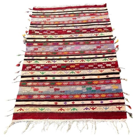 Vi præsenterer et ægte gammelt kaukasiskt kilim, der kommer fra Kaukasus-regionen, historisk forbundet med Rusland i produktionsperioden.