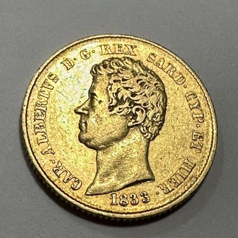 Guldmønt på 20 lire, renhed 900/1000, Kongeriget Sardinien under Karl Albert, 1840 P, antal eksemplarer 27 842, diameter 21 mm, vægt 6,45 g, tilstand ikke vurderet. Se billederne for en korrekt gengivelse.
