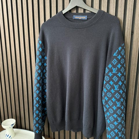 Striktrøje Louis Vuitton til mænd i original, lavet af fint strikket garn med ikonisk color block-design i nuancerne sort, creme og elektrisk blå. Trøjen har en ren og samtidig moderne linje, med klassisk rund halsudskæring og afbalanceret pasform, ideel både til høj-kvalitets afslappet brug og til mere gennemførte looks. I bunden er der påsat Louis Vuitton America’s Cup-mærket, et karakteristisk detaljer, der fremhæver plagget og bekræfter, at det tilhører en særlig kollektion. Indvendigt findes mærket Louis Vuitton Paris og de originale sammensætnings- og vaskeetiketter.
