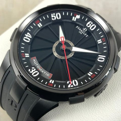 Perrelet Turbine XL Automatic A1050/1, model fra 2020+, schweizisk automatisk bevæger P-331, sort urskive, 48 mm titanium- og rustfrit stålkasse, sort gummirem, nytilstand med original emballage, dokumenter og et‑års garanti. Klik på den blå "gå til varen" knap, for at købe eller byde på denne vare. Den samlede pris vil blive vist inden du afgiver dit bud.