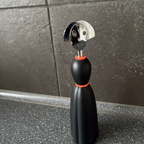 Designerne har også introduceret en lille variation i den sædvanlige struktur af dette værktøj: Når kværnen ikke er i brug, sidder den med kværnmekanismen opad. Kværnen er således tydeligt fremhævet, stilfuldt indrammet af møllens karakteristiske design. Det er en funktionelt vigtig detalje, da den efter brug