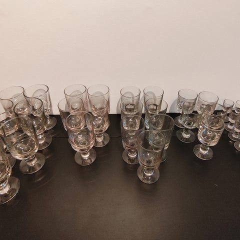 En elegant samling af franske vintage shotglas, oprindeligt designet til vodka og spiritus, præsenteret på en slående gul plade, der fremhæver deres visuelle appel. Sættet inkluderer en række raffinerede modeller, hver med sin egen karakteristiske form, hvilket afspejler mangfoldigheden og håndværket i fransk glashåndværk.