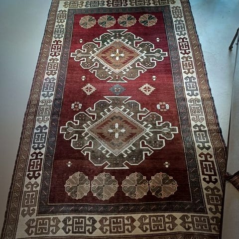 Tæppe samergand, et tæppe med smukke farver. Et geometrisk mønster som shirvan. Nyt, glansfuldt og skinnende uld, som fotos ikke helt kan fange kvaliteten og glansen af tæppet. Gå ikke glip af chancen. Tro mig, et tæppe du kan trampe på i 100 år. I dag er det en god handel for den, der køber, men jeg ved ikke, om man i fremtiden vil finde disse kvaliteter af tæpper. Hav det sjovt, giv dit bud, og tag et smukt, sjældent tæppe med hjem.