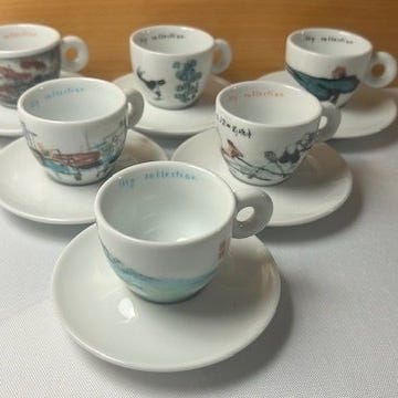6 espressokopper med underkop fra illy art collection 1992 “Arte e mestieri”, den allerførste illy art-kollektion.