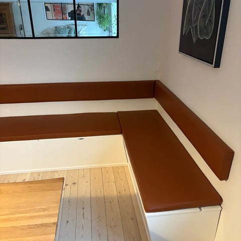 Vi laver også hynder i moderne møbelstoffer og læder lavet på mål så de passer til bænken.