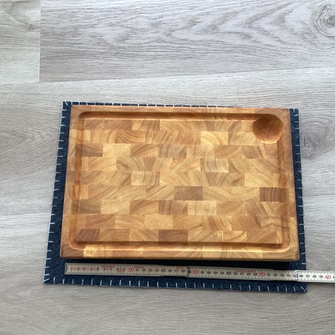 Skagerak Trip Trap skærebræt i massivt træ. Rektangulært skærebræt med saftrille langs kanten og rund fordybning i det ene hjørne. Brættet har kraftig tykkelse og integrerede greb i siderne, hvilket gør det velegnet som stabilt underlag til udskæring og anretning i køkkenet.