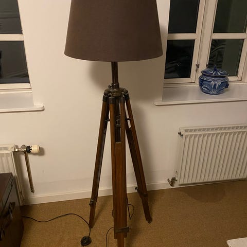 Der er en mindre løshed ved det markerede område på billedet, men ellers fungerer lampen perfekt. Stellet er udført i patineret metal med delvist forkromede detaljer. Den justerbare arm gør det let at rette lyset præcist derhen, hvor du har brug for det. 800kr.