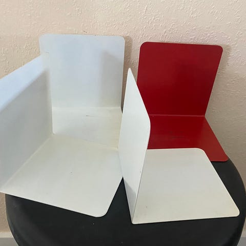 Bogstøtte hvidlakeret metal. Monteres på kanten af en bordplade eller hylde uden brug af skruer. Egnet til at holde bøger, mapper, magasiner eller skærebrætter adskilt og oprejst.