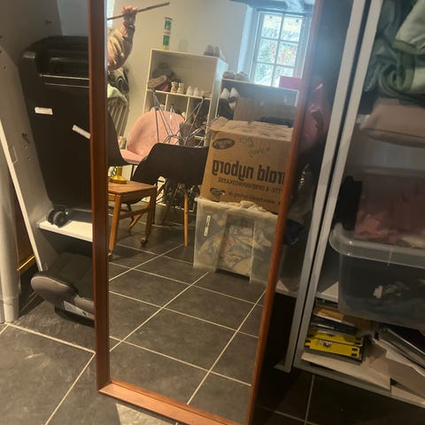 Fint gammelt spejl med teakramme. Det har lidt ridser på rammen. Det måler 92x41 cm.