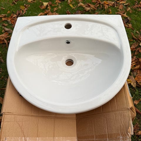 Håndvask i hvidt porcelæn. Vasken er buet i front med lige bagkant og afløbshul placeret centralt. Monteringsbeslag er integreret på undersiden. Velegnet til montering på badeværelse eller gæstetoilet, hvor der ønskes en kompakt, vægmonteret håndvask i klassisk hvid porcelæn.
