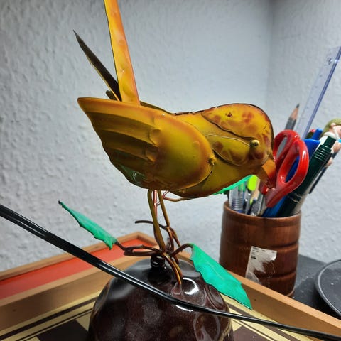 Metal påfugl i blå og turkis. Figuren forestiller en stående påfugl med lang hale og fine detaljerede fjer. Materialet er lakeret metal med malede farver og mønstre. Måler ca 90 cm i højden. Sender ikke.