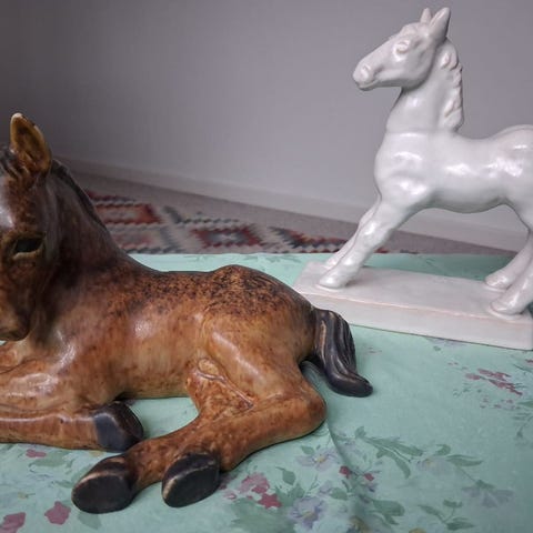 Hestefigur i keramik i brunlige nuancer. Figuren forestiller en græssende hest og har detaljeret overfladestruktur. Undersiden viser fire ben med markeringer under hovene, og på siden ses et indridset trekantmærke. Egnet som dekoration i hjemmet, fx på hylde, reol eller vindueskarm. 23 x30 Cm.(Michael Andersen fra Bornholm ) 1400,-kr Hentes i Ballerup