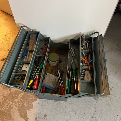 Trækasse værktøjskasse med metalforstærkninger. Kassen er rektangulær med låg og bærehåndtag på siden. Udvendige mål er cirka 57 cm i længden, 38 cm i bredden og 21 cm i højden. Kan anvendes til opbevaring af værktøj, smådele eller andet udstyr. Indvendigt er kassen uden ruminddeling. Ydersiden er i træ med metalbeslag langs kanter og hjørner samt metal-lukketøj på fronten.