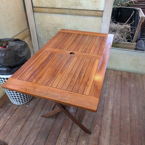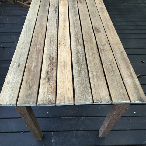 Bordoverfladen har den helt rigtige sølvgrå farve efter flere års sol og vind - og bevidst fravalg af olie/lakbehandling.