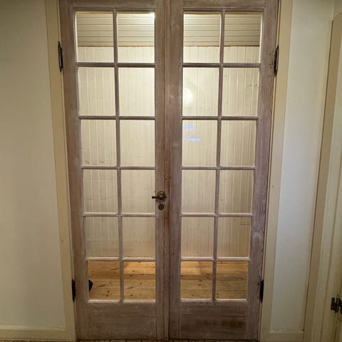 Indvendig glasdør med hvidmalet ramme og sprosser. Døren har glasfelter og er udstyret med messingfarvet dørgreb og nøglehul. Velegnet som rumadskillelse i bolig, hvor der ønskes lysgennemgang mellem rummene.