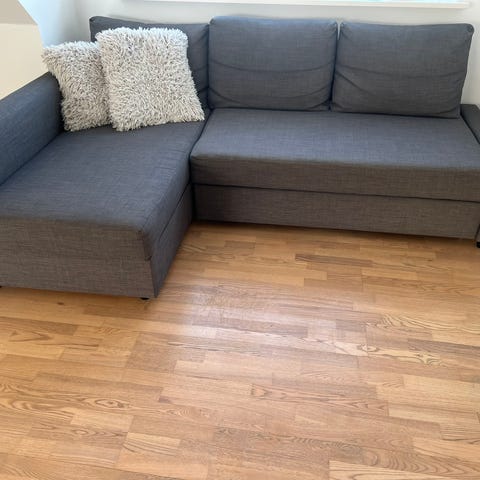 Sælger vores FRIHETEN hjørnesovesofa i mørkegrå. Sofaen er pæn og velholdt og fungerer perfekt både som sofa og nem gæsteseng. Den har indbygget opbevaring under chaiselongen – super praktisk til dyner og puder.