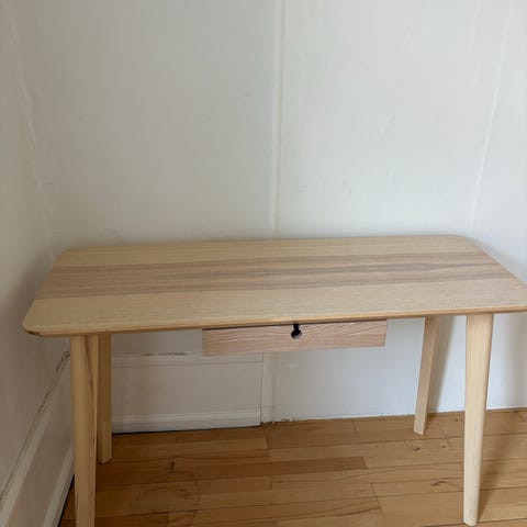 2 stk Ilva skrivebord i træ i brun/naturfarvet finish. Bordet har rektangulær bordplade med let buet forkant og fire skråtstillede ben. Under bordpladen er der en skuffe til opbevaring af mindre genstande som kontorartikler eller tilbehør. Egnet som lille arbejdsplads, skrivebord eller konsolbord i stue, kontor eller soveværelse. Pris per stk. Stol(er) kan medkøbes (replika)