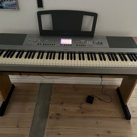 The Yamaha DGX-630 (also known as the YPG-635) is a versatile digital piano that blends an authentic acoustic feel with extensive keyboard features. The instrument has 88 full-size keys, a silver-colored cabinet with wooden details and an accompanying stand, as well as pedals. The piano has built-in speakers and various connection options on the back, including headphones. The stand is worn, as visible in the picture, but functional.
