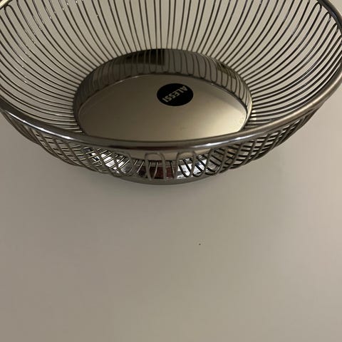 Alessi avisholder og frugtkurv. 600 kr. for avisholder og 300 kr. for frugtkurv.
