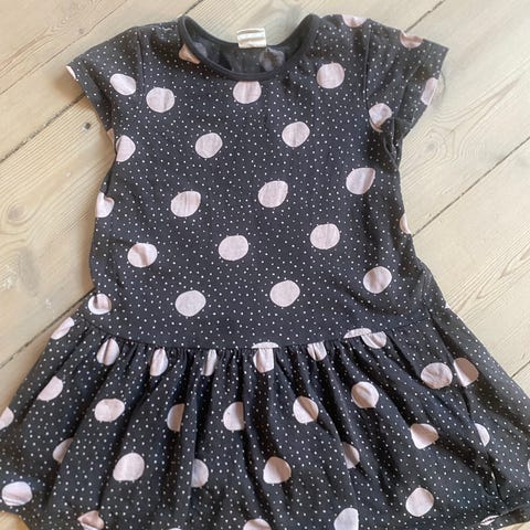 H&M kjole til pige i str. 80. Kjolen er i blå bomuld med ærmeløs overdel og rund hals. Skørtet er rynket og har broderet kant med blomsterdetaljer forneden og et tyl underlag så det giver et sødt strut. Lukkes med knapper i ryggen. Velegnet som hverdags- eller festkjole.