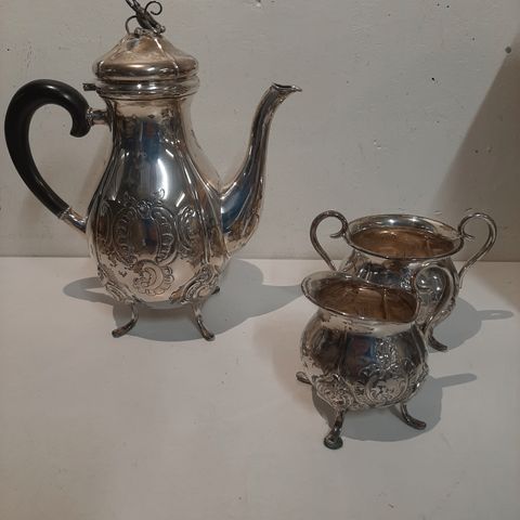 Svaneholm Flores Verni kaffestel med underkopper tallerkener alt med guldkant. Inklusiv krukke med låg og lysestag. Fremstår uden skår.