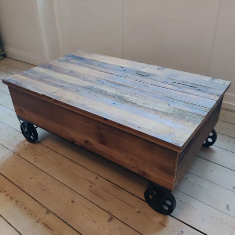 Rustikt sofabord med hjul og hylde