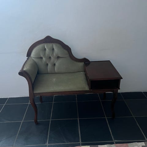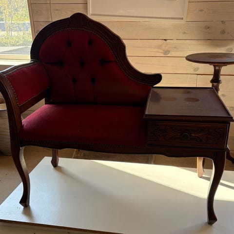 Vintage telefonbænk med træstel og polstret sæde i brun velour-lignende stof. Bænken har integreret sidebord med en skuffe til opbevaring. Ryglænet er let buet med knaplukning og udskårne trædetaljer. Benene er svungne i klassisk stil. Egnet som lille siddeplads i entré, gang eller stue med mulighed for opbevaring i skuffen og på bordpladen.