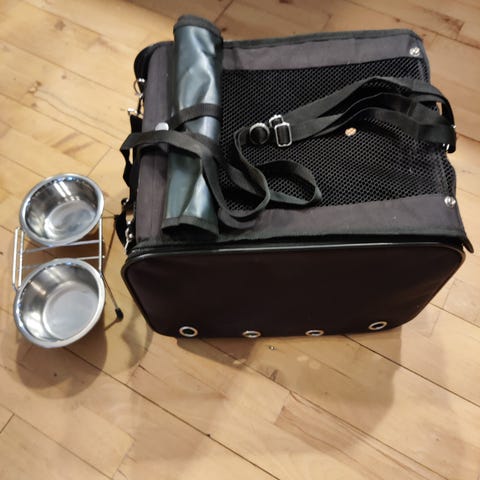 Transporttaske til kæledyr i gråt stof med sorte detaljer. Tasken har netpaneler på sider og ender for ventilation og udsyn, samt åbning i den ene ende. Der er bærestropper på toppen, så den kan bæres i hånden eller over skulderen. Egnet til mindre kæledyr som hund eller kat til transport i bil eller offentlig transport.