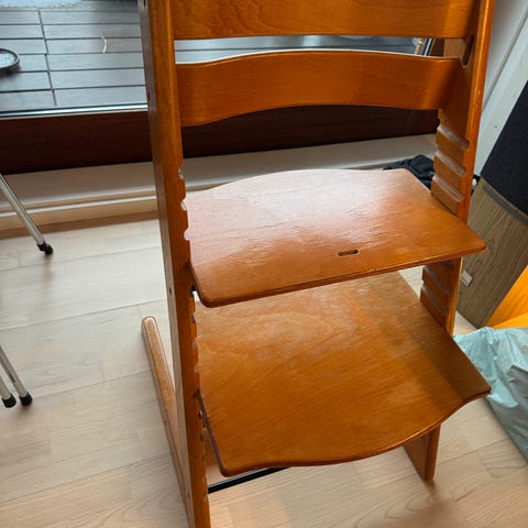 Ældre højstol i træ (den gamle model med bøjle). Den er brugt men stadig stabil og i fin stand. Bøjle og strop haves også hvis det har interesse.