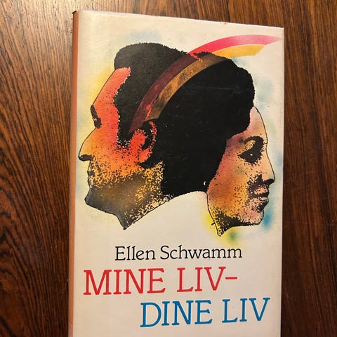 Denne bog, 'Mine Liv-Dine Liv' af Ellen Schwamm, er udgivet af Gyldendals Bogklub. Bogens cover har et kunstnerisk portræt med levende farver. Bagsiden er ensfarvet med et rødt design, og ryggen viser tydelig bevaringstilstand med få tegn på alder og brug.