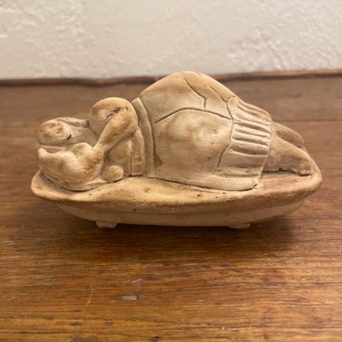 Ukendt mærke figurpar forestillende et bondepar. Figuren viser en mand og en kvinde gående side om side, hvor kvinden bærer en kurv på armen. Farven er brun, og materialet fremstår som keramik eller lignende hårdt materiale. Velegnet som dekoration i stue, reol eller på hylde.