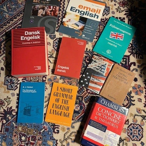 To opgavebøger og en ordbog til engelsk.