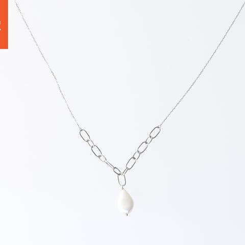 En elegant halskæde bestående af en kæde af sølvfarvet metal. Halskæden er dekoreret med brune og lyse perler i forskellige størrelser, der hænger forskudt langs kæden. Den har en længde på 46 cm og er forsynet med en lås til at lukke. Tags: halskæde, perler, smykker, elegant