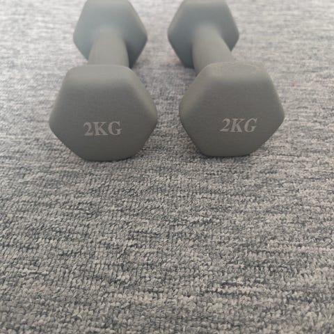 Sæt med to håndvægte på hver 5 kg i beige farve. Håndvægtene har sekskantede ender, som mindsker risikoen for at de ruller væk under brug eller opbevaring. Velegnet til hjemmetræning, genoptræning og let styrketræning af arme, skuldre og overkrop.