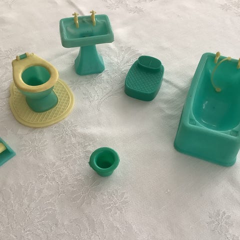 Dette er en lille plastikmodel af et toilet og en toiletpapirholder. Objektet er anvendt som legetøj eller som del af en miniature samling for dukkehuse eller lignende. Toilettet har en hvid låg og er primært orange, sammen med den orange toiletpapirholder, der har en klar stang til toiletpapiret.