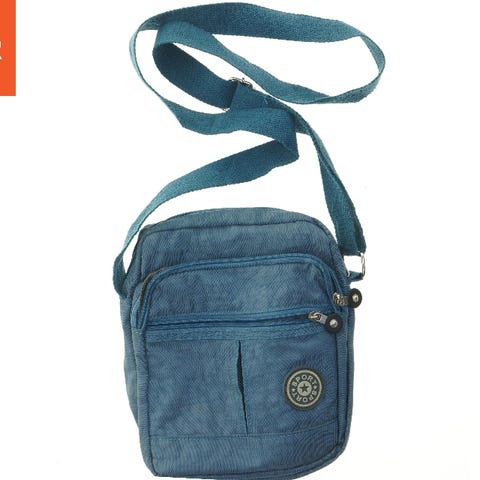 Denne taske er en kompakt skuldertaske lavet af blå stofmateriale. Den har flere små lommer på fronten med lynlås og en trykknap, hvilket giver praktisk opbevaring af dine ejendele. Tasken har en enkelt strop, som kan justeres for komfortabel bæring. Tasken er 18x23,5 cm i størrelse, ideel til let transport af mindre genstande.