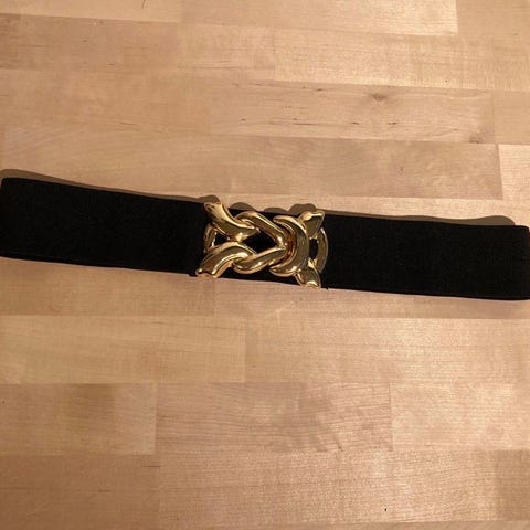 Dette er et stilfuldt bælte lavet af sort materiale med en flot guldfarvet beslag. Bæltet har en almindelig spænde og flere huller til justering af længden. Det kommer også med en stofpose, der ser ud til at have et logo eller et emblem trykt på den. Størrelsen på bæltet er 80 cm.