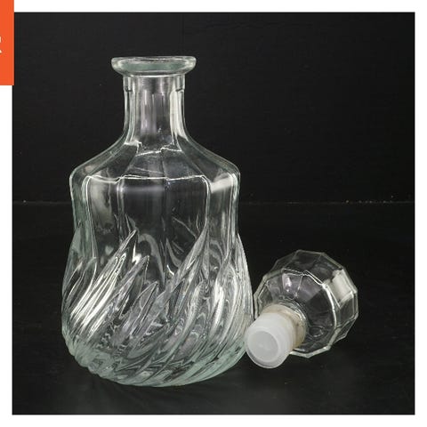 En glaskarafel med glasprop, som er dekoreret med kortspilsymboler: hjerter, spar, ruder og klør i røde og sorte farver. Karaflens størrelse er 16x8 cm, perfekt til servering af spiritus eller vin. Den har et skakmønster nederst, og proppen er lavet af glas.