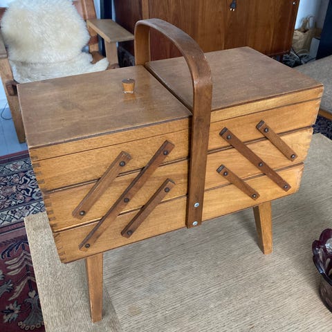 Stor teak sykasse meget velholdt men med brugsspor højde 19cm - med hank 30,5cm længde 45cm bredde 23cm . Udslået 113cm. Sendes ikke