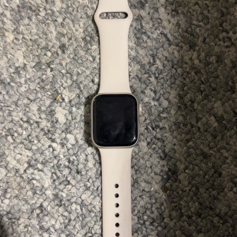 Uret leveres i original æske med magnetisk opladerkabel synligt på billederne. Modellen har rektangulær touchskærm og justerbar rem med flere huller, så det kan tilpasses forskellige håndledsstørrelser. Velegnet som smartwatch til daglig brug med funktioner som notifikationer, aktivitets- og tidsregistrering afhængigt af tilsluttet iPhone og softwareversion.