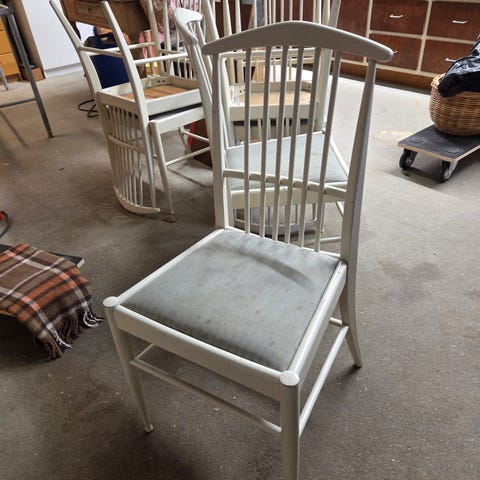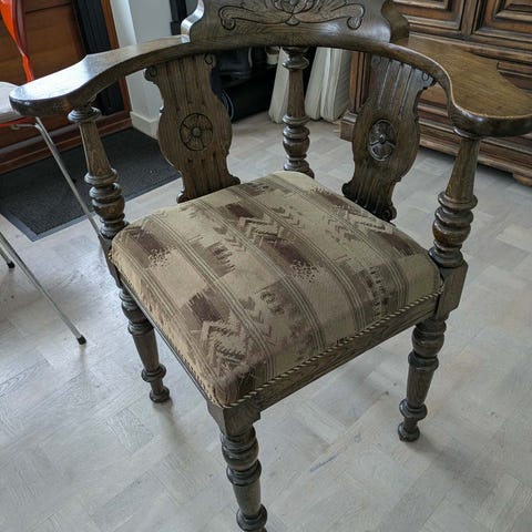 Jeg har en flig fra en af stolene, som kan limes fast. Den viser også den oprindelige træsort.