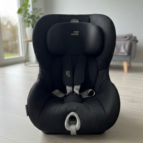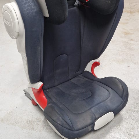 Britax Römer autostol. Autostolen har høj ryg og justerbar hovedstøtte. Sædet har polstret sidde- og ryglæn samt sidebeskyttelse. Betrækket er i rød og sort tekstil med lyse ydersider. Velegnet som bilsæde til større børn i den angivne størrelse med brug af bilens trepunktssele.