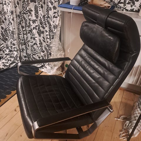 Lænestol med høj ryg og integreret nakkepude. Stolen har polstret sæde og ryglæn med knapdetaljer og er betrukket med brunt læder. Den er monteret på en drejefod i metal med fire ben og har glatte, mørke sider på ryglænet. Velegnet som læse- eller hvilestol i stue eller opholdsrum.