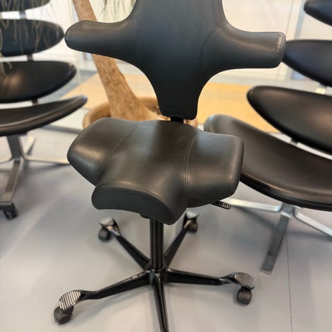 Brunt læder. Capisto stel grå lak. Lift, siddehøjde 265 mm. Bløde hjul til hårde gulve.