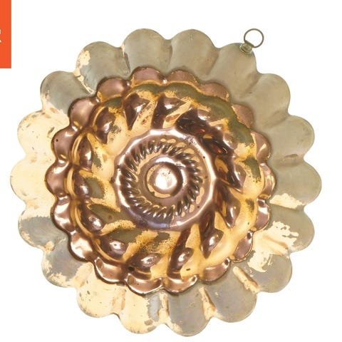 Denne kobberform har en diameter på 23 cm. Den har et indviklet mønster og en hængerkrog for nem ophængning. Formens overflade viser tegn på tidligere brug med visse patina pletter, der giver den en vintage charme.