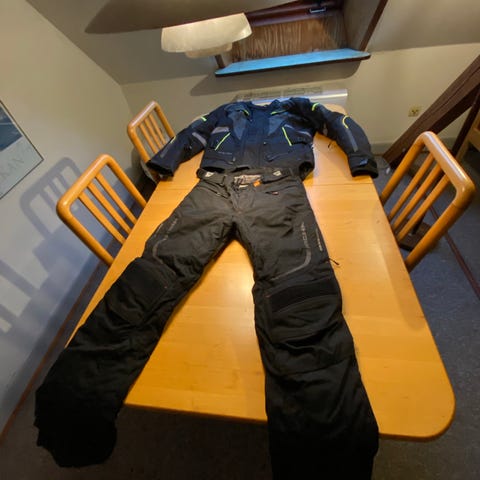 motorcykeljakke og bukser sæt i sort tekstil. Sættet består af en jakke med flere yderlommer, justerbare stropper i livet og på ærmerne samt forstærkede områder på skuldre og albuer. Bukserne har forstærkede knæpartier, lynlåse ved benafslutning og refleksdetaljer. Sættet er egnet som beskyttende motorcykelbeklædning til brug i forskellige vejrforhold.