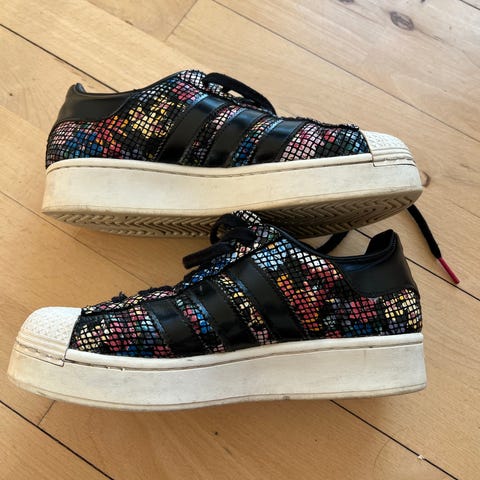 Adidas Superstar sneakers i str. 37,5. Klassiske hvide sneakers med sorte striber og sort hælkappe med Adidas-logo. Overdel i læder med shell toe-detalje i gummi foran og snørelukning. Ydersål i gummi med mønster for bedre fodfæste. Velegnet som hverdagssko og fritidssko. Meget behagelig med ortholite sål.