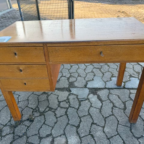 Skrivebord i mørkt træ. Bordet har et fastmonteret skuffemodul i den ene side med to skuffer og udskårne greb. Stellet er i metal med en enkel, funktionel konstruktion. Velegnet som arbejdsbord eller skrivebord i kontor, værksted eller hobbyrum.