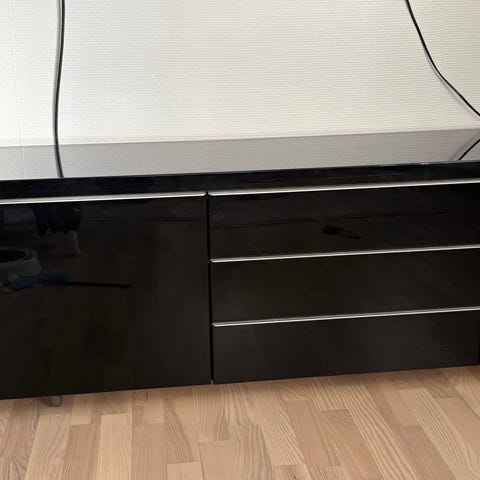 Meget fine skabe, med glasplade på toppen, så ingen tydelige brugsspor. Der er plads i glaspladen til kabler kan gå ned i skabet. Hylder i alle tre skabe. Kan hænge på væggen eller så på gulvet.