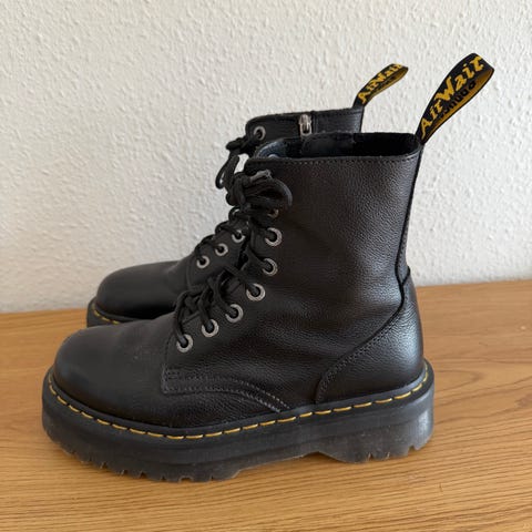 Dr. Martens støvler i sort læder i størrelse 44. Klassiske snørestøvler med høj skaft og karakteristisk gul syning langs sålen. Overdel i glat læder, indvendig foring i læder/tekstil og kraftig gummisål med mønster for bedre greb. Velegnet som hverdagsfodtøj eller til mere robust brug i køligere vejr.